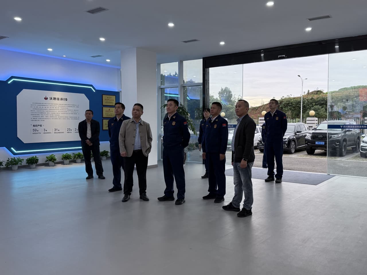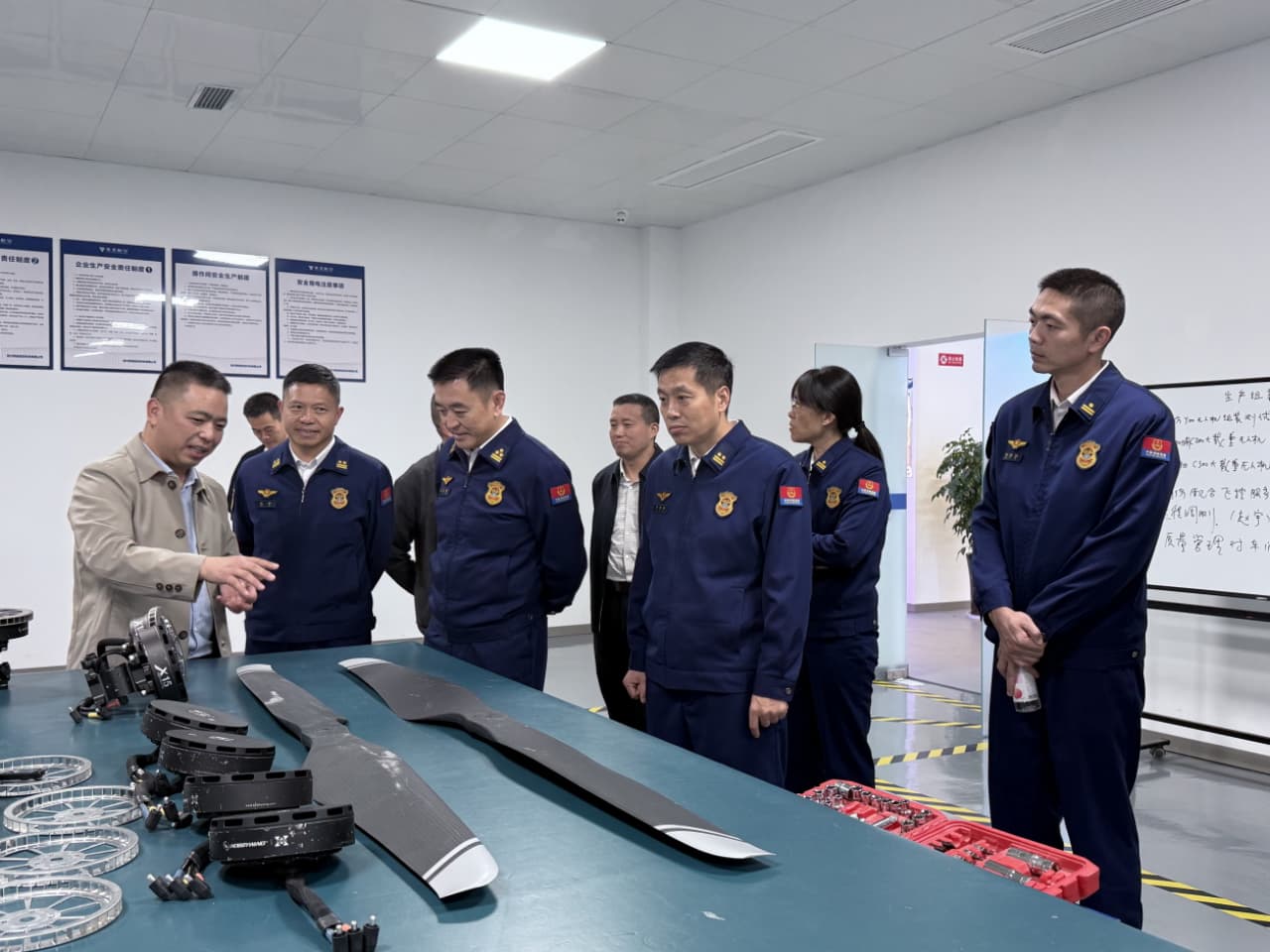 在何进总经理的引导下,李代明副总队长一行先观看了消防无人机实际应用短片,参观了公司文化展厅,深入了解了乘圣航空的发展历程与企业核心文化,随后,走访了生产制造车间,系统了解了消防无人机从零部件精密加工到整机组装调试的全过程。